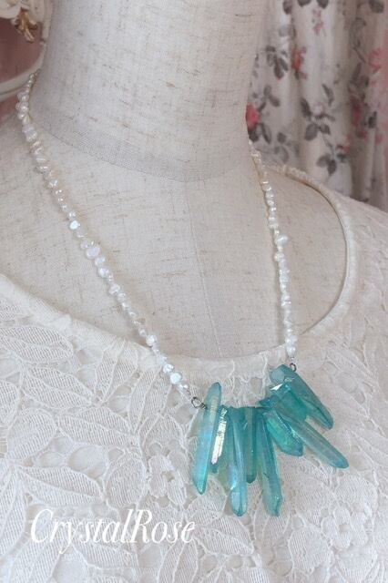 あえて不揃いな淡水パールとアクアオーラのポイントを繋いでいます。
